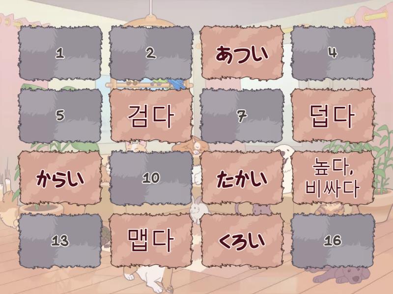 たかい - 높다, 비싸다, からい - 맵다, くろい - 검다, あつい - 덥다, たのしい - 즐겁다, だめだ - 안된다, じょうずだ - 잘하다, きらいだ - 싫어하다,