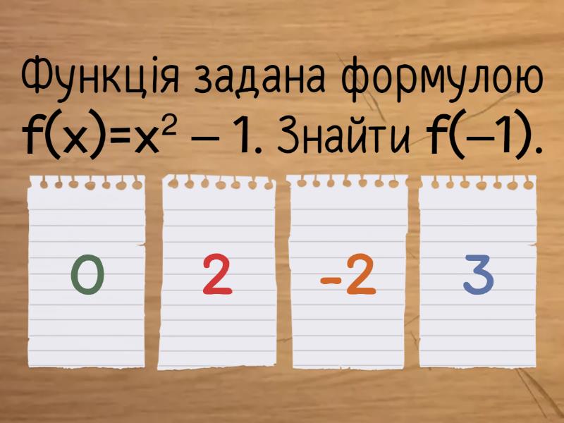 1) Функція задана формулою f(x)=x2 – 1. Знайти f(–1). a) 0 b) 2 c) -2 d) 3 2) Яка з функцій є квадратичною? a) у=х2-10х+20 b) у= 1/х2 c) у=х-9 d) у=4-2х+х3 3) Знайти координати перетину з віссю ОХ: у=х2 − 4х + 3 . a) немає нулів b) (3;0), (1;0) c) (3;1) d) (0;1), (0;3) 4) Встановити за графіком проміжки, на яких функція набуває додатних значень . a) (3; 5) b) (–∞; 3) U(5; +∞) c) (–∞; 4) d) (4; +∞) 5) Який з графіків відповідає функції у = 2−х2 ? a) b) c) d) 6) Знайти вершину параболи y=(х + 2)2 − 1 . a) (2;1) b) (-1;2) c) (-2;-1) d) (2;-1) 7) Визначте координати вершини параболи: у=х2−6х+4 . a) (0;4) b) (3;-5) c) (6;4) d) (-5;3) 8) Графік якої функції зображено на малюнку? a) у=2(х+1)2−8 b) у=(х−8)2 +1 c) у=(х+1)2−8 d) у=8(х+1)2−2 9) Знайдіть нулі функції у(х) = х2 − 20х + 84 . a) -14 та 6 b) 14 та 6 c) 14 та - 6