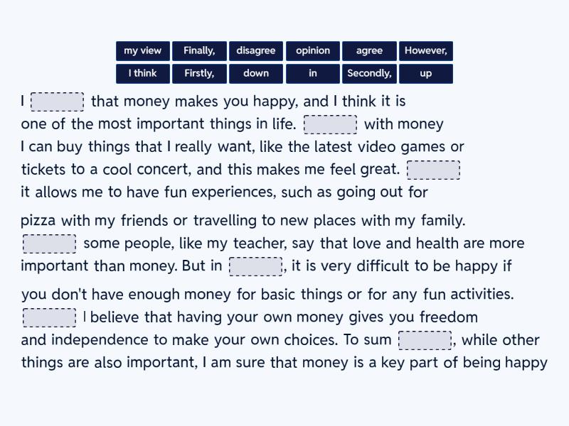 I ____ that money makes you happy, and I think it is one of the most important things in life. ____ with money I can buy things that I really want, like the latest video games or tickets to a cool concert, and this makes me feel great. ____ it allows me to have fun experiences, such as going out for pizza with my friends or travelling to new places with my family. ____ some people, like my teacher, say that love and health are more important than money. But in ____, it is very difficult to be happy if you don't have enough money for basic things or for any fun activities. ____ I believe that having your own money gives you freedom and independence to make your own choices. To sum ____, while other things are also important, I am sure that money is a key part of being happy