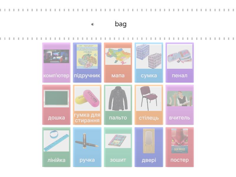 сумка - bag, дошка - board, стілець - chair, пальто - coat, комп'ютер - computer, двері - door, зошит - exercise book, мапа - map, пенал - pencil case, ручка - pen, постер - poster, гумка для стирання - rubber, лінійка - ruler, вчитель - teacher, підручник - textbook,