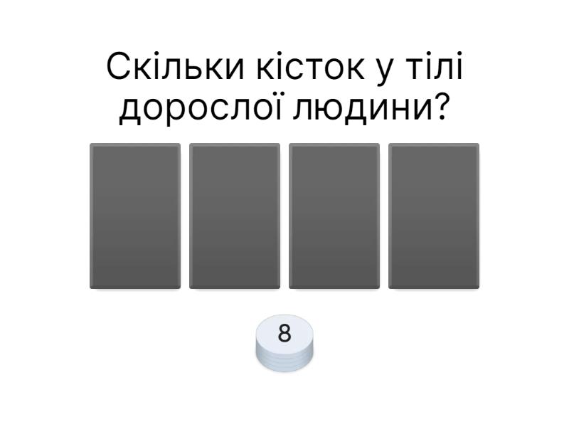 1) Скільки кісток у тілі дорослої людини? a) 206 b) 208 c) 201 d) 198 2) Який орган фільтрує артеріальну кров у тілі? a) серце b) печінка c) нирки d) та не знаю 3) Яка частина мозку відповідає за рівновагу? a) Гіпоталамус b) кора головного мозку c) серце d) мозочок 4) Який орган є найбільшим у тілі людини? a) печінка b) шкіра c) мозок d) легені 5) Скільки камер має серце людини? a) 2 b) 3 c) 4 d) 1 6) Як називається трубка, яка зʼєднує рот з шлунком? a) трахея b) кишечник c) стравохід d) мозок 7) Де виробляються еритроцити ? a) у кістковому мозку b) у серці c) у печінці d) у трахеї 8) Яка частина нервової системи контролює дихання? a) спинний мозок b) мозочок c) довгастий мозок d) мозок 9) Де знаходиться зорова зона мозку ? a) потилична частка b) у центрі мозку c) у любовій частці  d) скронева частка 10) Як називається головна частина мозку,що відповідає за мислення та мову? a) мозочок b) міст c) стовбур мозку d) кінцевий мозок 11) Укажіть назву гормону, що продукує зображена залоза a) соматотропін b) дофамін c) адреналін d) інсулін 12) Який м'яз допомогає працювати дихальній системі? a) діафрагма b) біцепс c) сідничний d) тріцепс 13) Педикульоз – захворювання шкіри, яке обумовлюється паразитуванням a) грибів b) членистоногих 14) Укажіть захворювання, яке спричинюється неклітинною формою життя. a) педикульоз b) ботулізм c) холера d) СНІД e) стригучий лишай f) ангіна 15) Пацієнтка звернулась до сімейного лікаря, який діагностував їй ендемічний зоб. Яку рекомендацію стосовно раціону харчування має надати лікар? a) вживати більшу кількість фторованих продуктів b) вживати більшу кількість продуктів, що багаті на вітамін А c) вживати більшу кількість морської капусти d) вживати сок цитрусових для відновлення нормального вмісту вітаміну С 16) Яку рекомендацію стосовно раціону харчування має надати лікар-стоматолог? a) вживати більшу кількість білкових продуктів b) вживати продукти, що багаті на вітамін А c) продукти, багаті на кальцій та фосфор d) вживати томатний сік для відновлення нормального вмісту вітаміну С 17) Слухова труба, також відома як євстахієва труба, є важливим каналом, який з'єднує носоглотку з a) зовнішнім вухом b) внутрішнім вухом c) середнім вухом d) гортанню 18) Про яку хворобу йде мова: “потрапивши в рану через контакт з ґрунтом, збудник починає мігрувати до нервових закінчень, продукуючи екзотоксин" a) коклюш b) правець c) аскаридоз d) сказ 19) Яка судина несе кров від лівого шлуночка в організмі людини? a) аорта b) ворітна вена c) легенева артерія d) легенева вена 20) Де відбувається запліднення в організмі жінки? a) в піхві b) в маткових трубах c) в матці d) в яєчниках