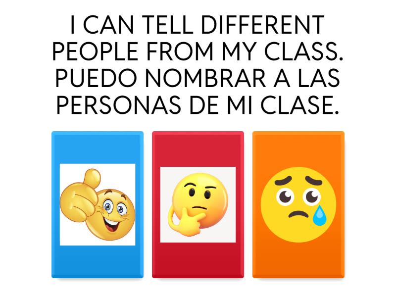 1) I CAN TELL DIFFERENT PEOPLE FROM MY CLASS. PUEDO NOMBRAR A LAS PERSONAS DE MI CLASE. a) b) c) 2) I CAN NAME MY FRIEND, CLASSMATE AND TEACHER. (PUEDO NOMBRAR A MI AMIGO, COMPAÑERO Y PROFESORA) a) b) c)