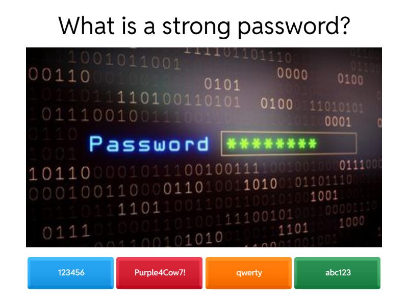 1) What is a strong password? a) 123456 b) Purple4Cow7! c) qwerty d) abc123 2) What is a digital footprint? a) Your shoe size b) Footprint on sand c) A sticker for your phone d) Your online history 3) What is cross-site tracking? a) A new line on the Underground b) Companies following your searches c) A new movie at Cineworld d) An app to save your photos 4) To check if a website if fake you should... a) Check spelling mistakes in the link b) Ignore the design c) Click all links d) Trust pop-ups 5) What is private information? a) Photo of Lima, Peru b) The location of Asda c) Weather updates d) Home address 6) Which should you NOT share on social media? a) Name and address b) Favorite color c) Pet's name d) Hobby 7) What is voice control? a) Text messages b) Voice commands c) Video calls d) Email alerts 8) What is Speak Screen? a) Reads text aloud b) A shade for your window c) A new dance step d) Plays music 9) Which application (app) would be used to find out how to get to Charing Cross Station? a) Notes b) Google Pages c) Google Maps d) Edit photos 10) What is one way to protect personal information online? a) Use strong passwords b) Share everything c) Ignore privacy settings d) Give information to strangers 11) What is phishing? a) The new McDonald's Sandwich b) Fishing sport c) Online shopping d) Fraudulent or Fake Emails or Ads 12) Where can you check accessibility features? a) Safari b) On top of the Empire State Building c) In Settings d) Ask George the cat 13) Which application (app) would be used to create a personal photo album? a) Google Maps b) Google Pages c) Notes d) Photos 14) Your friend can share your photo online without asking you. a) True b) False 15) Texting or calling someone at 3:00 in the morning can cause Digital Drama. a) True b) False