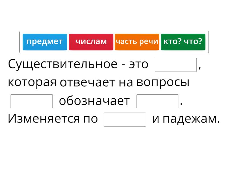 Существительное - это ____, которая отвечает на вопросы ____ обозначает ____. Изменяется по ____ и падежам.