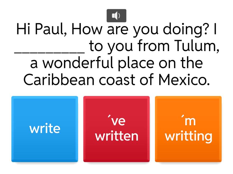 1) Hi Paul, How are you doing? I _________ to you from Tulum, a wonderful place on the Caribbean coast of Mexico. a) write b) ´ve written c) ´m writting 2) I _________ here with my family six days ago. a) ´m travelling b) travelled c) travell 3) We arrived ____________ Wednesday morning, a) at b) in c) on 4) and we __________ for one more week. a) 're going to stay b) will stay c) stay 5) We ____________ in a fantastic hotel on the beach. a) stay b) stayed c) are staying 6) The hotel is ____________ than most hotels in Europe, and the weather is very nice. a) cheaper b) the cheapest c) more cheap 7) There aren't ___________ tourists at the moment, because it's the low season, and that is perfect, a) many b) much c) some 8) because I don't like _______________ tourists. a) --- b) a c) the 9) I like to relax ____________ on the beach. a) quiet b) quieter c) quietly 10) Yesterday we rented a car and we ________ to different spots along the coast. a) drove b) were drive c) drived 11) I saw some of ___________ views in Mexico. a) the amazingest b) the more amazing c) the most amazing 12) _____________ Saturday we're going to buy some souvenirs and finally on Sunday we're coming back home. a) Next b) The next c) On the next 13) I'll tell you everything when I come back. Would you like to have dinner with __________ one day?  a) me b) my c) I 14) I want to thank you for taking care of my cat. I hope you aren't having __________ problems. a) some b) no c) any 15) She ________ a bit annoying sometimes.   Bye for now!  Vicky. a) can to be b) cans be c) can be