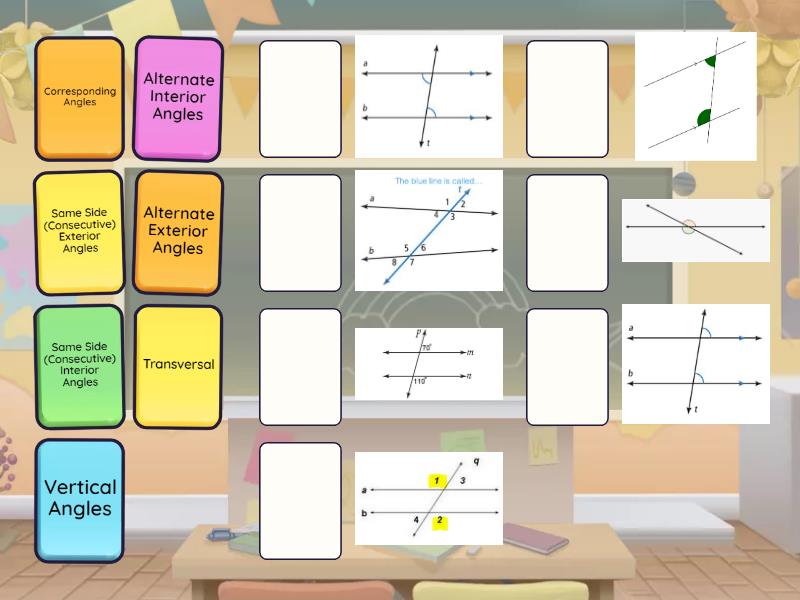 Corresponding Angles, Alternate Interior Angles, Transversal, Vertical Angles, Alternate Exterior Angles, Same Side (Consecutive) Interior Angles, Same Side (Consecutive) Exterior Angles,