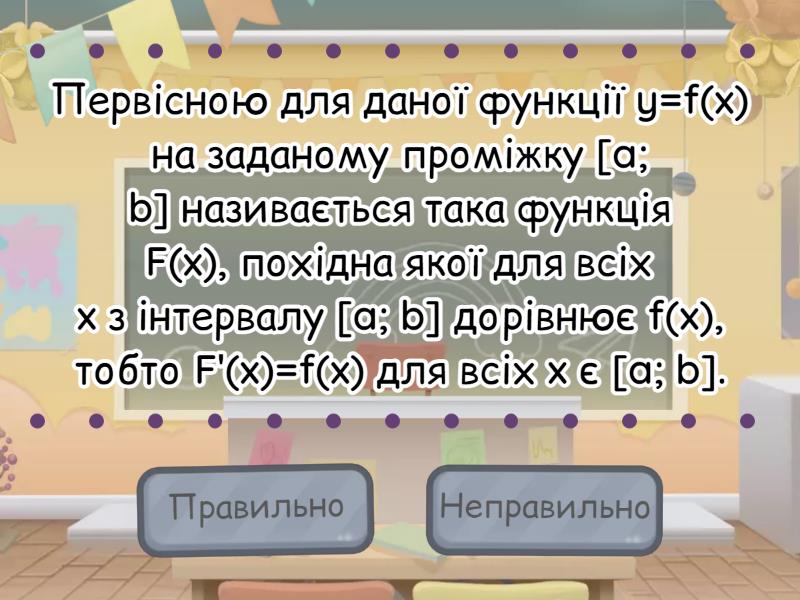 Правильно: Первісною для даної функції y=f(x) на заданому проміжку [a; b] називається така функція F(x), похідна якої для всіх x з інтервалу [a; b] дорівнює f(x), тобто Fʹ(x)=f(x) для всіх x є [a; b]., Графіки будь-яких двох первісних для функції f одержуються один із одного паралельним перенесенням вздовж осі ΟΥ, Фізичний зміст первісної - обернена властивість, тобто за відомою формулою швидкості ми можемо відновити закон руху., Для обчислення визначеного інтеграла використовують формулу Ньютона-Лейбница:∫ ab f(x) dx = F(x) | ab = F(b) - F(a), Різниця F(b)−F(a) називається визначеним інтегралом функції f(x) на відрізку [a;b]., Неправильно: Кожна функція має лише одну первісну, Інтеграл добутку (частки) функцій дорівнює сумі (різниці) інтегралів:, Сталий множник, що дорівнює нулю, можна виносити з-під знака інтеграла, тобто: ∫𝑘𝑓(𝑥)𝑑𝑥=𝑘∫𝑓(𝑥)𝑑𝑥, якщо 𝑘≠0., За допомогою первісної можна обчислювати площу криволінійної трикутника. Для цього використовують визначений інтеграл:S = ∫ ab f(x) dx, Геометричний зміст невизначеного інтеграла полягає в тому, що функція є рівняння сім’ї кривих, які утворюються одна з одної паралельним перенесенням уздовж осі абсциз.,