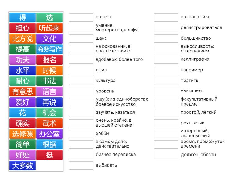 选 - выбирать, 选修课 - факультативный предмет, 根据 - на основании, в соответствии с, 爱好 - хобби, 功夫 - умение, мастерство, конфу, 武术 - ушу (вид единоборств); боевое искусство, 听起来 - звучать, казаться, 挺 - очень, крайне, в высшей степени, 有意思 - интересный, любопытный, 文化 - культура, 语言 - речь; язык, 机会 - шанс, 书法 - каллиграфия, 得 - должен, обязан, 花 - тратить, 再说 - вдобавок, более того, 比方说 - например, 商务写作 - бизнес переписка, 确实 - в самом деле; действительно, 简单 - простой, лёгкий, 担心 - волноваться, 提高 - повышать , 水平 - уровень, 好处 - польза , 耐心 - выносливость; с терпением, 大多数 - большинство, 时候 - время, промежуток времени, 报名 - регистрироваться, 办公室 - офис,