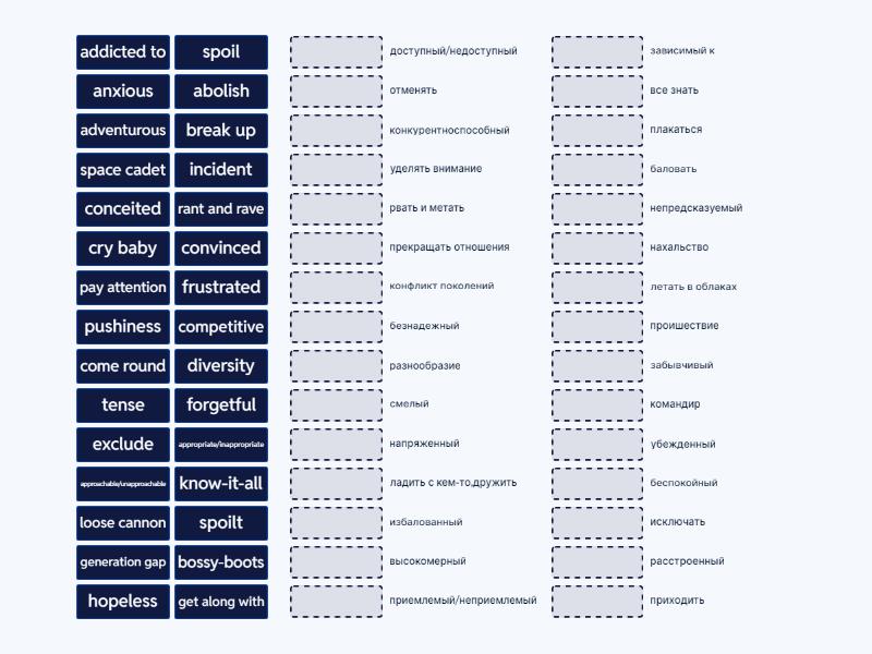 abolish - отменять, addicted to - зависимый к, adventurous - смелый, anxious - беспокойный, approachable/unapproachable - доступный/недоступный, appropriate/inappropriate - приемлемый/неприемлемый, bossy-boots - командир, break up - прекращать отношения, come round - приходить, competitive - конкурентноспособный, conceited - высокомерный, convinced - убежденный, cry baby - плакаться, diversity - разнообразие, exclude - исключать, forgetful - забывчивый, frustrated - расстроенный, generation gap - конфликт поколений, get along with - ладить с кем-то,дружить, hopeless - безнадежный, incident - проишествие, know-it-all - все знать, loose cannon - непредсказуемый, pay attention - уделять внимание, pushiness - нахальство, rant and rave - рвать и метать, space cadet - летать в облаках, spoil - баловать, spoilt - избалованный, tense - напряженный,