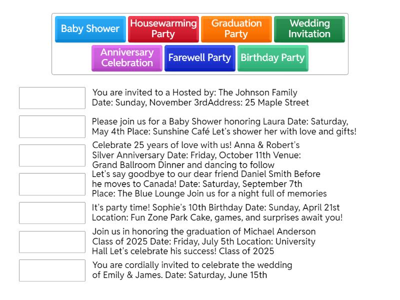 Wedding Invitation - You are cordially invited to celebrate the wedding of Emily & James. Date: Saturday, June 15th , Graduation Party - Join us in honoring the graduation of Michael Anderson Class of 2025 Date: Friday, July 5th Location: University Hall Let’s celebrate his success! Class of 2025, Birthday Party - It’s party time! Sophie’s 10th Birthday Date: Sunday, April 21st Location: Fun Zone Park Cake, games, and surprises await you! , Baby Shower - Please join us for a Baby Shower honoring Laura Date: Saturday, May 4th Place: Sunshine Café Let’s shower her with love and gifts! , Anniversary Celebration - Celebrate 25 years of love with us! Anna & Robert’s Silver Anniversary Date: Friday, October 11th  Venue: Grand Ballroom  Dinner and dancing to follow, Farewell Party - Let’s say goodbye to our dear friend Daniel Smith Before he moves to Canada! Date: Saturday, September 7th Place: The Blue Lounge Join us for a night full of memories , Housewarming Party - You are invited to a Hosted by: The Johnson Family  Date: Sunday, November 3rdAddress: 25 Maple Street  ,