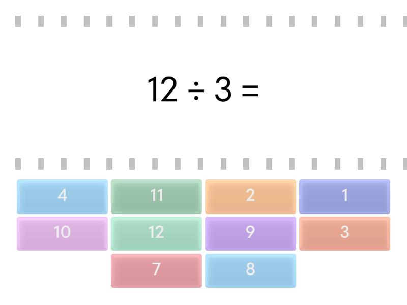 4 - 12 ÷ 3 =, 7 - 35 ÷ 5 =, 2 - 20 ÷ 10 =, 11 - 44 ÷ 4 =, 10 - 20 ÷ 2 =, 1 - 10 ÷ 10 =, 12 - 36 ÷ 3 =, 3 - 6 ÷ 2 =, 9 - 72 ÷ 8 =, 8 - 24 ÷ 3 =,