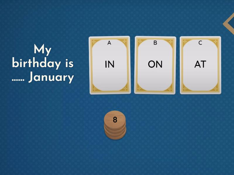 1) My birthday is ...... January a) IN b) ON c) AT 2) Holidays begin ...... Saturday, July 18th a) IN b) ON c) AT 3) We go to the beach ...... the Summer a) IN b) ON c) AT 4) What time does the Racing-Boca match start? a) IN 9 PM b) ON 9 PM c) AT 9 PM 5) The party is ...... the 12th of March a) IN b) ON c) AT 6) I was born in 1956.  a) IN b) ON c) AT 7) Do you wear formal clothes ....... Christmas? a) IN b) ON c) AT 8) I usually stay in ........ the weekend. a) IN b) ON c) AT 9) She doesn't get up early .......the morning. a) IN b) ON c) AT 10) I go home ....... lunch time. a) IN b) ON c) AT