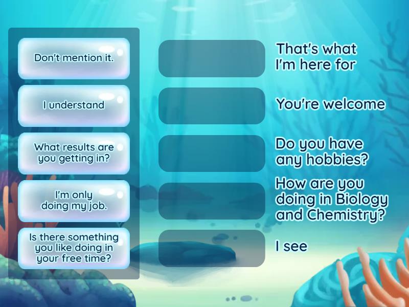 I understand - I see, Is there something you like doing in your free time? - Do you have any hobbies?, What results are you getting in? - How are you doing in Biology and Chemistry?, Don't mention it. - You're welcome, I'm only doing my job. - That's what I'm here for,