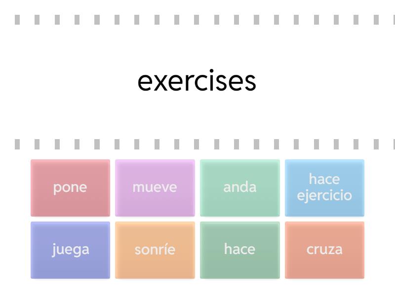 hace ejercicio - exercises, pone - puts, sonríe - smiles, hace - does/makes, mueve - moves, juega - plays, anda - walks, cruza - crosses,