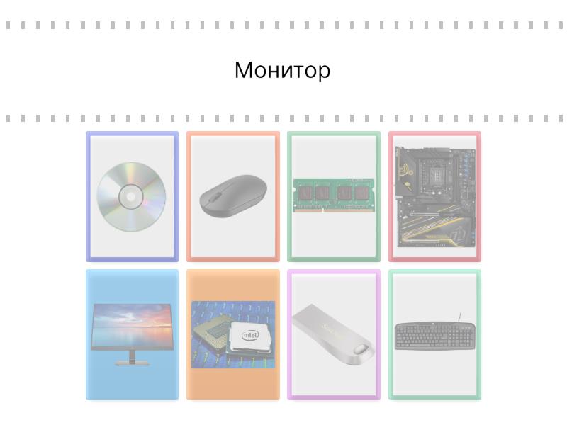 Монитор, аналық тақша, процессор, жедел жады, USB, CD,DVD дискіжетек, пернетақта, тінтуір,