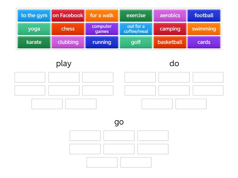 play: football, computer games, chess, cards, basketball, golf, do: karate, exercise, yoga, aerobics, go: out for a coffee/meal, camping, swimming, on Facebook, to the gym, for a walk, running, clubbing,