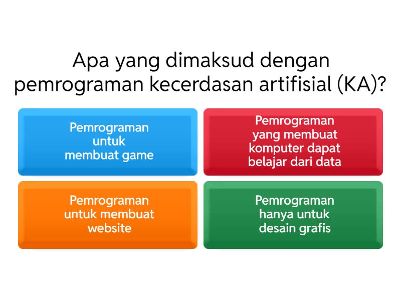 1) Apa yang dimaksud dengan pemrograman kecerdasan artifisial (KA)? a) Pemrograman untuk membuat game b) Pemrograman yang membuat komputer dapat belajar dari data c) Pemrograman untuk membuat website d) Pemrograman hanya untuk desain grafis 2) Contoh aplikasi sehari-hari yang menggunakan KA adalah … a) Microsoft Word untuk mengetik b) Kalkulator biasa c) Filter spam pada email d) Mesin fotokopi 3) Mengapa data sangat penting dalam pemrograman KA? a) Karena KA hanya bisa berjalan tanpa data b) Karena data adalah bahan belajar bagi model KA c) Karena data hanya berfungsi sebagai dekorasi d) Karena data hanya digunakan untuk menyimpan file 4) Manakah pernyataan yang benar tentang penerapan KA? a) KA hanya bisa digunakan di bidang komputer b) KA tidak dapat digunakan dalam kehidupan nyata c) KA bisa digunakan di berbagai bidang, seperti kesehatan, bisnis, dan pendidikan d) KA hanya bisa berjalan dengan internet 5) Pemrograman KA dimulai dari....... a) Input → Proses → Output b) Input → Output→ Proses