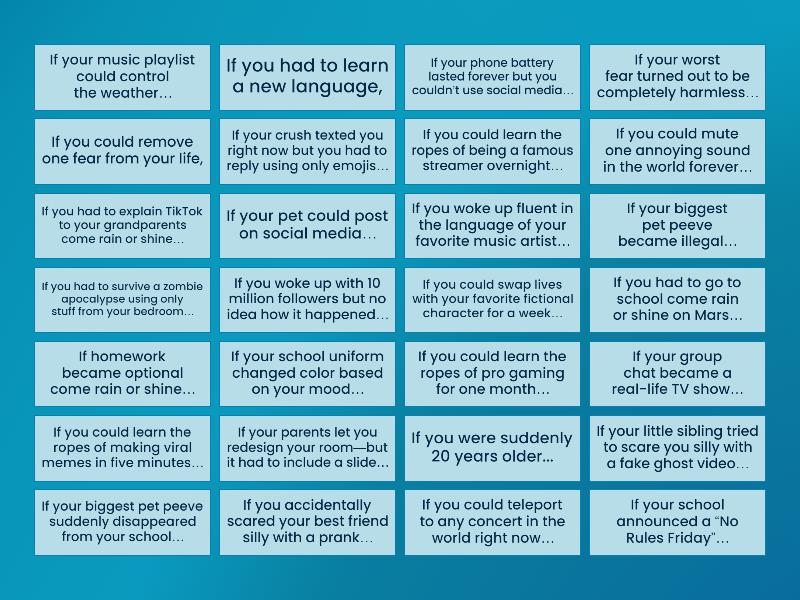 If you had to learn a new language,, If you could remove one fear from your life,, If you could learn the ropes of being a famous streamer overnight…, If your phone battery lasted forever but you couldn’t use social media…, If your biggest pet peeve suddenly disappeared from your school…, If you could swap lives with your favorite fictional character for a week…, If your crush texted you right now but you had to reply using only emojis…, If you had to go to school come rain or shine on Mars…, If your little sibling tried to scare you silly with a fake ghost video…, If you woke up fluent in the language of your favorite music artist…, If your group chat became a real-life TV show…, If you could mute one annoying sound in the world forever…, If you woke up with 10 million followers but no idea how it happened…, If homework became optional come rain or shine…, If you could learn the ropes of making viral memes in five minutes…, If your school announced a “No Rules Friday”…, If your pet could post on social media…, If your biggest pet peeve became illegal…, If you had to survive a zombie apocalypse using only stuff from your bedroom…, If your music playlist could control the weather…, If you accidentally scared your best friend silly with a prank…, If you could teleport to any concert in the world right now…, If your school uniform changed color based on your mood…, If you could learn the ropes of pro gaming for one month…, If your parents let you redesign your room—but it had to include a slide…, If your worst fear turned out to be completely harmless…, If you had to explain TikTok to your grandparents come rain or shine…, If you were suddenly 20 years older...,