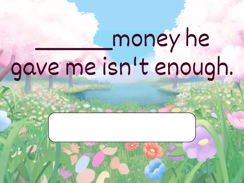 I like listening to ______ music. It helps me relax., ______money he gave me isn't enough., He doesn't like ______ dogs. One bit him when he was a baby., Could you please pass me ______ salt?, Do you want ______ aspirin? I think I've got some in my back., I can drive ______ kids to school today. You relax., This is my uncle. He's ______ teacher who lives in London., Is there ______ train station near your house?, I got ______ new bike. I've started cycling now and wanted to get more serious., They finally fixed ______ leaky pipe in the toilet!, That was ______ interesting presentation. I think you did a great job., Could you pass me ______ pen? I need to write this down before I forget.