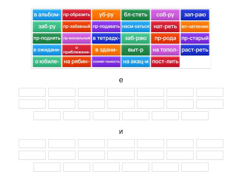 е: соб-ру, нат-реть, пост-лить, выт-р, заб-ру, раст-реть, бл-стеть, уб-ру, на рябин-, на топол-, в тетрадк-, в альбом-, о юбиле-, пр-забавный, пр-образить, пр-старый, насм-хаться, пр-подавать, вп-чатление, сознат-льность, и: заб-раю, зап-раю, на акац-и, о приближени-, в ожидани-, пр-поднять, в здани-, пр-вокзальный, пр-рода,