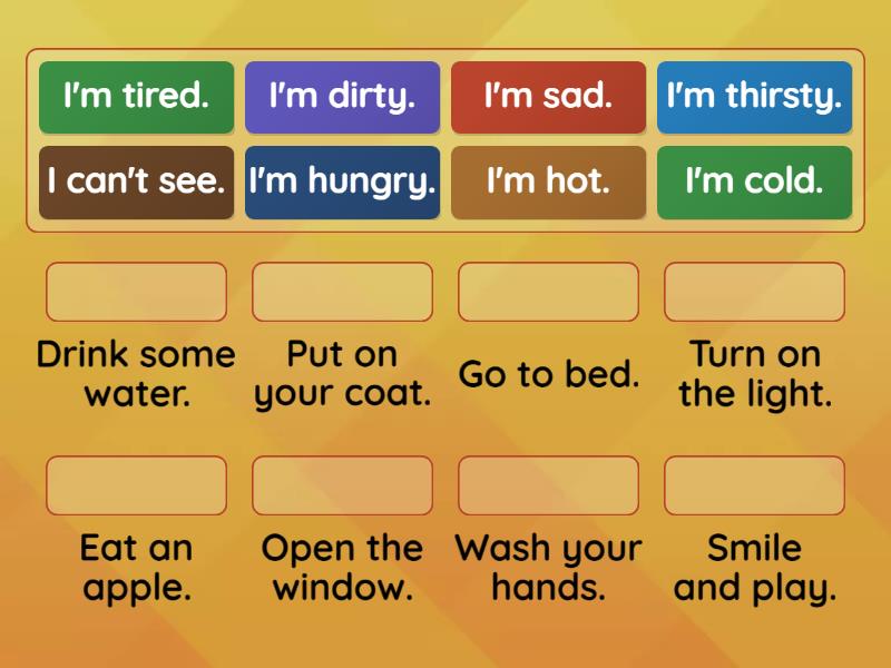 I'm hungry. - Eat an apple., I'm tired. - Go to bed., I'm hot. - Open the window., I'm dirty. - Wash your hands., I'm thirsty. - Drink some water., I can't see. - Turn on the light., I'm sad. - Smile and play., I'm cold. - Put on your coat.,