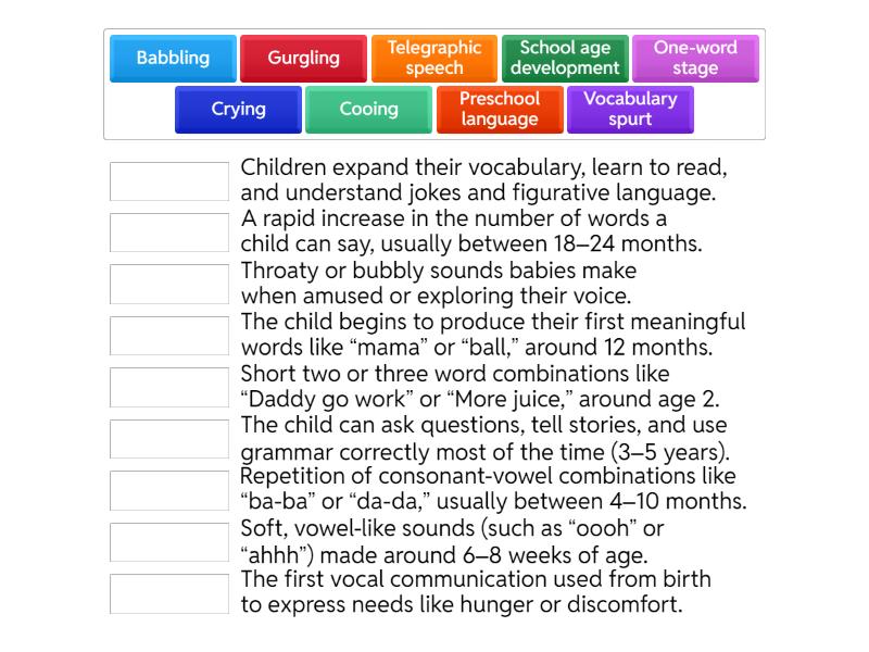 Preschool language - The child can ask questions, tell stories, and use grammar correctly most of the time (3–5 years)., School age development - Children expand their vocabulary, learn to read, and understand jokes and figurative language., One-word stage - The child begins to produce their first meaningful words like “mama” or “ball,” around 12 months., Babbling - Repetition of consonant-vowel combinations like “ba-ba” or “da-da,” usually between 4–10 months., Cooing - Soft, vowel-like sounds (such as “oooh” or “ahhh”) made around 6–8 weeks of age., Gurgling - Throaty or bubbly sounds babies make when amused or exploring their voice., Crying - The first vocal communication used from birth to express needs like hunger or discomfort., Vocabulary spurt - A rapid increase in the number of words a child can say, usually between 18–24 months., Telegraphic speech - Short two or three word combinations like “Daddy go work” or “More juice,” around age 2.,