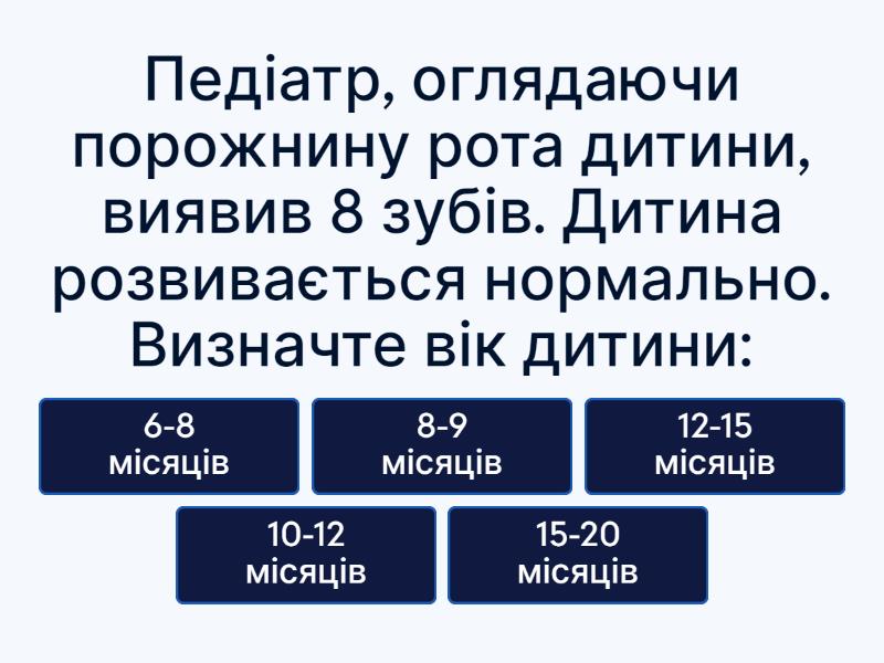 1) Педіатр, оглядаючи порожнину рота дитини, виявив 8 зубів. Дитина розвивається нормально. Визначте вік дитини: a) 6-8 місяців b) 8-9 місяців c) 12-15 місяців d) 10-12 місяців e) 15-20 місяців 2) Оглядаючи ротову порожнину у хворого 19-ти років, стоматолог звернув увагу на зруйнований язиково-дистальний горбик жувальної поверхні лівого першого верхнього моляра. Цей горбик називається: a) Метаконус b) Гіпоконус c) Параконус d) Мезоконус e) Протоконус 3) При огляді порожнини рота стоматолог виявив каріозну порожнину на поверхні коронки нижнього ікла, зверненої до першого малого кутнього зуба. Назвіть цю поверхню. a) Facies distalis b) Facies vestibularis c) Facies lingualis d) Facies mesialis e) Facies occlusalis 4) При огляді порожнини рота лікар виявив каріозну порожнину на поверхні першого малого кутнього зуба, зверненої до ікла. Як називається уражена поверхня коронки? a) Facies distalis b) Facies vestibularis c) Facies mesialis d) Facies lingualis e) Facies occlusalis 5) На поверхні коронки другого великого кутнього зуба, яка контактує з щокою, лікар виявив каріозну порожнину. Як називається вражена поверхня коронки? a) Facies lingualis b) Facies occlusalis c) Facies mesialis d) Facies vestibularis e) Facies distalis 6) У маленької п'ятирічної дівчинки лікар-стоматолог видалив зуб. який мав два корені. Який це зуб? a) Великий кутній нижньої щелепи b) Малий кутній нижньої щелепи c) Великий кутній верхньої щелепи d) Ікло верхньої щелепи e) Малий кутній верхньої щелепи 7) При огляді ротової порожнини стоматолог помітив появу у дитини перших постійних бічних різців. Який вік дитини? a) 6 років b) 7 років c) 11 років d) 9 років e) 13 років 8) При огляді новонародженої дитини педіатр виявив наявність в ротовій порожнині нижніх центральних різців. В якому віці вони прорізуються в нормі? a) До народження b) Впродовж першого місяця життя c) 10-12 місяців d) До 2-х років e) 6-8 місяців 9) Пацієнту видалили зуб. Коронка зуба долотоподібна, широка, край вузький. Корінь конусоподібний, стиснутий із боків. Який зуб видалили? a) Нижній різець b) Верхній різець c) Нижнє ікло d) Верхній премоляр e) Нижній премоляр 10) Дитині 13 років видалили другий молочний великий кутній зуб. Який постійний зуб виросте на його місці? a) Третій великий кутній зуб b) Перший малий кутній зуб c) Другий малий кутній зуб d) Другий великий кутній зуб e) Перший великий кутній зуб 11) Під час вивчення розвитку зубів у людини в ембріональний і постембріональний період було встановлено, що вони є похідними: a) Ектодерми і мезодерми b) Ектодерми і ентодерми c) Ентодерми і мезодерми d) Ектодерми e) Мезодерми 12) У новонародженої дитини щелепи добре розвинені та в кожній є зачатки молочних і постійних зубів. Скільки зачатків зубів у новонародженого в одній щелепі? a) 20 молочних та 10 постійних b) 10 молочних та 8 постійних c) 10 молочних та 16 постійних d) 10 молочних та 10 постійних e) 20 молочних