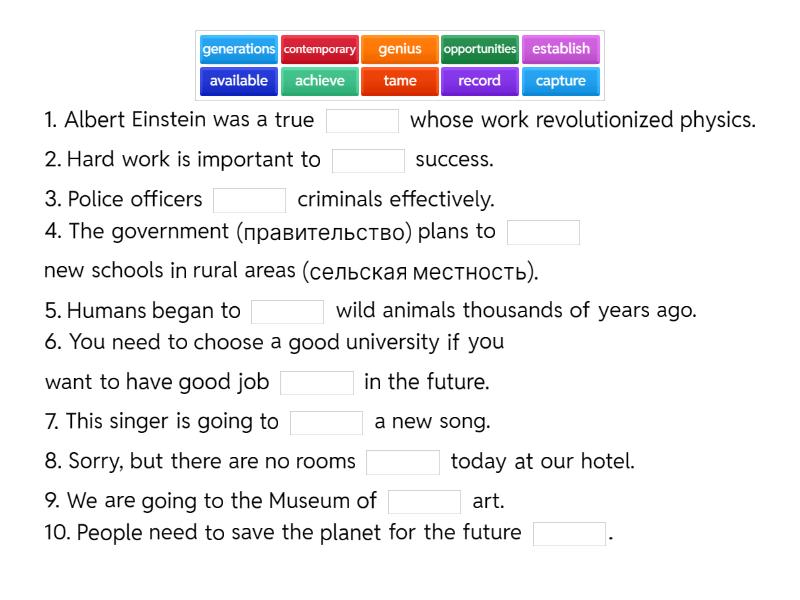 1. Albert Einstein was a true ____ whose work revolutionized physics. 2. Hard work is important to ____ success. 3. Police officers ____ criminals effectively. 4. The government (правительство) plans to ____ new schools in rural areas (сельская местность). 5. Humans began to ____ wild animals thousands of years ago. 6. You need to choose a good university if you want to have good job ____ in the future. 7. This singer is going to ____ a new song. 8. Sorry, but there are no rooms ____ today at our hotel. 9. We are going to the Museum of ____ art. 10. People need to save the planet for the future ____.