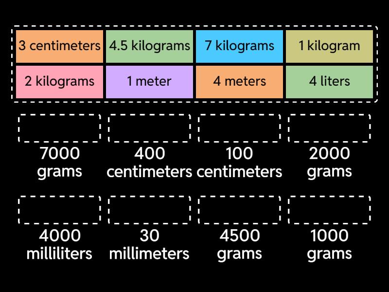1 kilogram - 1000 grams, 2 kilograms - 2000 grams, 3 kilograms - 3000 grams, 4.5 kilograms - 4500 grams, 7 kilograms - 7000 grams, 1 meter - 100 centimeters, 8 meters - 800 centimeters, 4 meters - 400 centimeters, 500 centimeters - 5 meters, 1 centimeter - 10 millimeters, 3 centimeters - 30 millimeters, 60 seconds - 1 minute, 1 year - 365 days, 2 kilometers - 2000 meters, 3 kilometers - 3000 meters, 4 liters - 4000 milliliters,