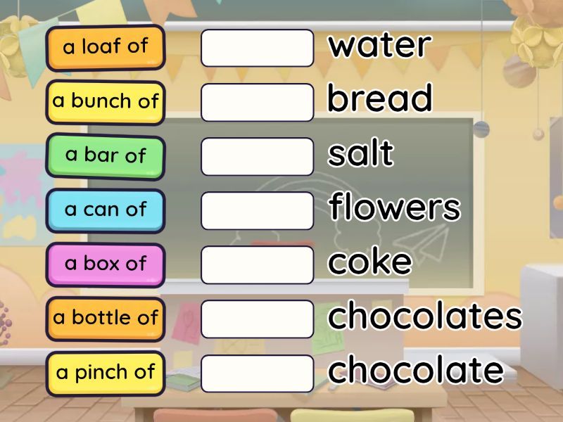 a bar of - chocolate, a packet of - biscuits , a jar of - jam, a bowl of - cereal, a loaf of - bread, a pinch of - salt, a bunch of - flowers, a box of - chocolates, a carton of - milk, a bottle of - water, a bag of - vegetables, a tin of - tuna, a can of - coke ,