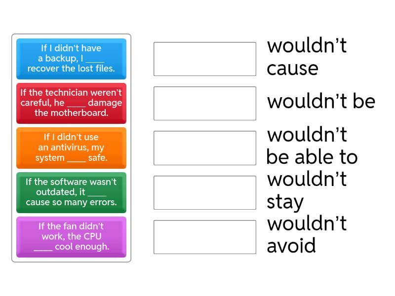 If the fan didn’t work, the CPU ____ cool enough. - wouldn’t stay, If I didn’t have a backup, I ____ recover the lost files. - wouldn’t be able to, If the technician weren’t careful, he ____ damage the motherboard. - wouldn’t avoid, If the software wasn’t outdated, it ____ cause so many errors. - wouldn’t cause, If I didn’t use an antivirus, my system ____ safe. - wouldn’t be,