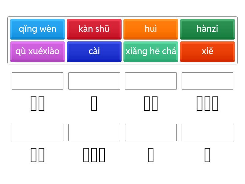 huì - 会, shuō - 说, cài - 菜, zuò - 做, xiě - 写, hànzi - 汉子, dú - 读, xīngqī - 星期, zuótiān - 昨天, qù xuéxiào - 去学校, kàn shū - 看书, qǐng wèn - 请问, xiǎng hē chá - 想喝茶, chī mǐfàn - 吃米饭, mǎi gè bēizi - 买个杯子,