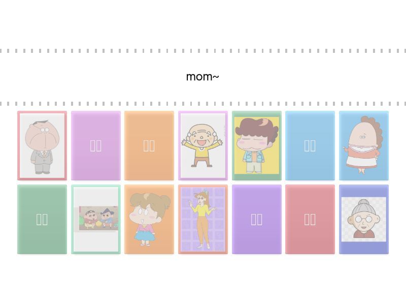 mom~, dad~, sister~, brother~, grandpa, grandma, friend~, teacher~, 媽媽 - mom, 爸爸 - dad, 兄弟 - brother, 姊妹 - sister, 朋友 - friend, 老師 - teacher,