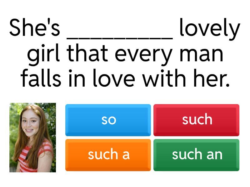 1) She's _________ lovely girl that every man falls in love with her. a) so b) such c) such a d) such an 2) She runs_________fast that nobody can catch her. a) so b) such c) such a d) such an 3) They were____________friendly people that we didn't want to leave them. a) so b) such c) such a d) such an 4) It was____________ easy test that everyone passed. a) so b) such c) such an d) such a 5) He served____________good food that I ate too much. a) so b) such c) such a d) such an 6) It's__________warm today that I don't need a coat. a) so b) such c) such a d) such an 7) It's difficult to understand him because he speaks _________ quietly. a) such b) so c) such a d) such an 8) It was a great holiday. We had _____________ good time. a) such b) so c) such a d) such an 9) The weather is beautiful. I didn't expect it to be ____________ nice day. a) so b) such c) such a d) such an 10) He always looks good. He wears ___________ nice clothes. a) such b) such a c) so d) such an 11) It was ___________ long day that I fell asleep on the couch as soon as I sat down. a) such a b) such an c) such d) so 12) My teacher asked _____________ unusual question that no one understood what she meant. a) such a b) such c) so d) such an 13) The question was __________ hard no one got it correct. a) so b) such c) such a d) such an 14) The koala looks like __________ cuddly animal, but it can actually hurt you. a) so b) such an c) such a d) such 15) He took ____________ long time to read the book! a) such b) so c) such a d) such an 16) That’s ________________ awful thing to say! a) such an b) such c) so d) such a 17) ______________ many people came to the party that we ran out of snacks. a) Such b) Such a c) Such an d) So 18) They were ____________ difficult directions to follow that we got lost 3 times. a) such a b) such c) so d) such an 19) These questions are _________ easy! a) so b) such an c) such d) such a 20) I had ______________ wonderful time in Japan that I would love to go back again. a) such b) such an c) such a d) so