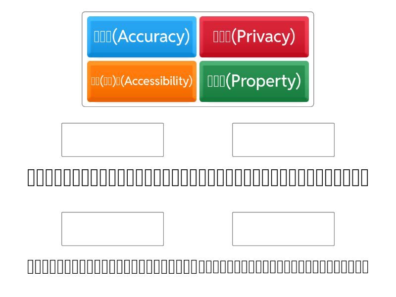 隱私權(Privacy) - 避免侵犯他人的個人隱私,不隨意散播或竊取個人資料, 精確性(Accuracy) - 傳播正確的資訊,避免散佈未經查證或可疑的消息。, 財產權(Property) - 不進行抄襲、盜拷,並遵守軟體授權合約。, 使用(存取)權(Accessibility) - 保障人們能夠公平地取得和使用資訊的權利,