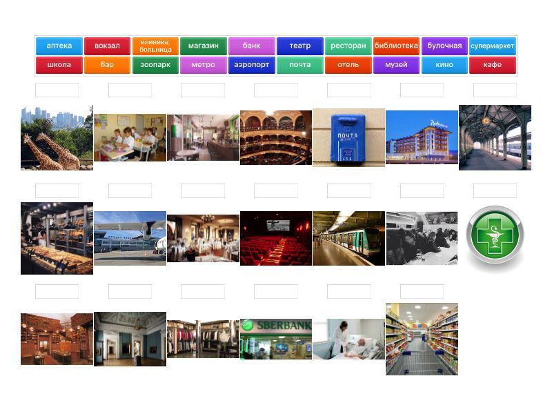 аптека, аэропорт, банк, бар, клиника, больница, вокзал, отель, кино, кафе, зоопарк, супермаркет, магазин, музей, почта, ресторан, театр, школа, метро, булочная, библиотека,