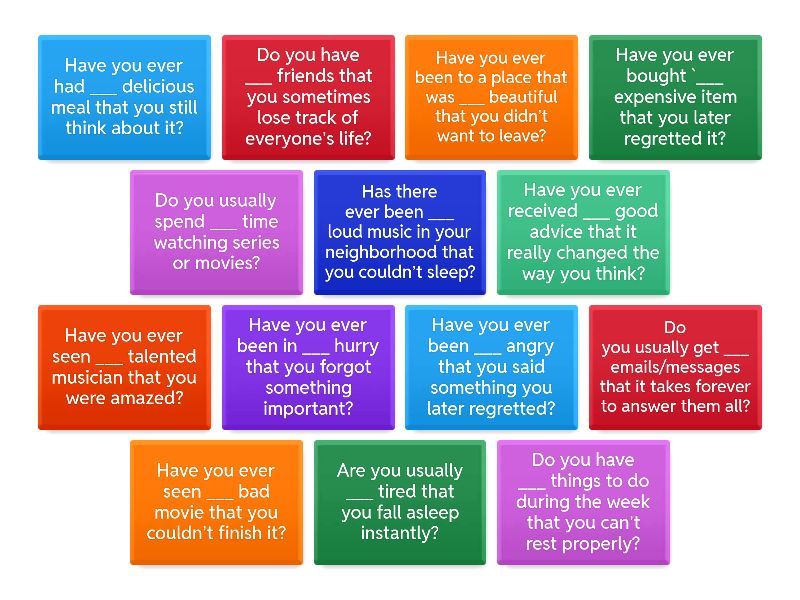 Have you ever been to a place that was ___ beautiful that you didn’t want to leave? - SO + ADJECTIVE, Do you have ___ things to do during the week that you can’t rest properly? - SO MANY + PLURAL COUNTABLE NOUN, Do you usually spend ___ time watching series or movies? - SO MUCH + UNCOUNTABLE NOUN, Have you ever had ___ delicious meal that you still think about it? - SUCH A + SINGULAR COUNTABLE NOUN, Do you have ___ friends that you sometimes lose track of everyone’s life? - SO MANY + PLURAL COUNTABLE NOUN, Have you ever bought `___ expensive item that you later regretted it? - SUCH AN + SINGULAR COUNTABLE NOUN, Have you ever seen ___ bad movie that you couldn’t finish it? - SUCH A + SINGULAR COUNTABLE NOUN, Do you usually get ___ emails/messages that it takes forever to answer them all? - SO MANY + PLURAL COUNTABLE NOUN, Has there ever been ___ loud music in your neighborhood that you couldn’t sleep? - SUCH + ADJECTIVE + UNCOUNTABLE NOUN, Are you usually ___ tired that you fall asleep instantly? - SO + ADJECTIVE, Have you ever been in ___ hurry that you forgot something important? - SUCH A + SINGULAR COUNTABLE NOUN, Have you ever seen ___ talented musician that you were amazed? - SUCH A + SINGULAR COUNTABLE NOUN, Have you ever received ___ good advice that it really changed the way you think? - SUCH + ADJECTIVE + UNCOUNTABLE NOUN, Have you ever been ___ angry that you said something you later regretted? - SO + ADJECTIVE,
