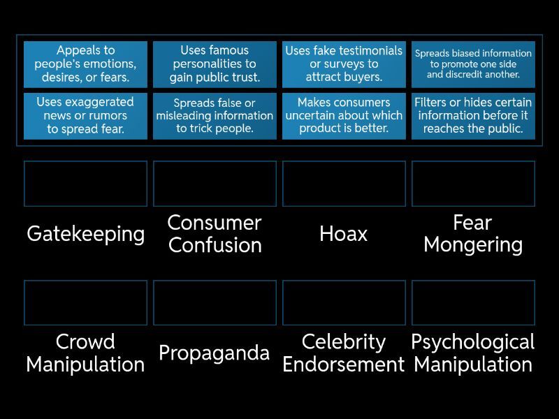 Makes consumers uncertain about which product is better. - Consumer Confusion, Uses fake testimonials or surveys to attract buyers. - Crowd Manipulation, Spreads biased information to promote one side and discredit another. - Propaganda, Filters or hides certain information before it reaches the public. - Gatekeeping, Uses famous personalities to gain public trust. - Celebrity Endorsement, Spreads false or misleading information to trick people. - Hoax, Appeals to people’s emotions, desires, or fears. - Psychological Manipulation, Uses exaggerated news or rumors to spread fear. - Fear Mongering,