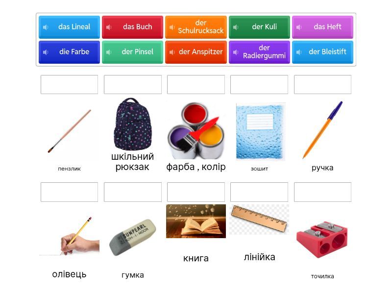der Anspitzer - точилка, der Bleistift - олівець , das Buch - книга, die Farbe - фарба , колір , das Heft - зошит , der Kuli - ручка , das Lineal - лінійка , der Pinsel - пензлик , der Radiergummi - гумка , der Schulrucksack - шкільний рюкзак ,