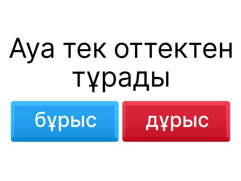1) Ауа тек оттектен тұрады a) бұрыс b) дұрыс 2) Азот ауаның ең көп бөлігін құрайды a) бұрыс b) дұрыс 3) Аргон-инертті газ a) бұрыс b) дұрыс 4) Көмірқышықл газы ауаның 50%-ын құрайды a) дұрыс b) бұрыс 5) Ауа-газ қоспасы a) дұрыс b) бұрыс 6) Ауа құрамындағы аргон-1% ға жуық a) бұрыс b) дұрыс