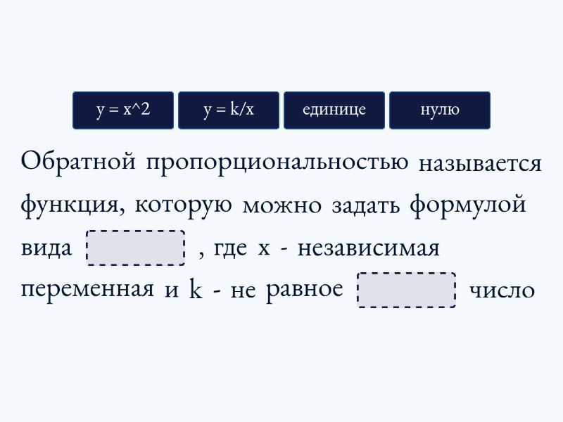 Обратной пропорциональностью называется функция, которую можно задать формулой вида ____ , где х - независимая переменная и k - не равное ____ число Кривую, являющуюся графиком ____ пропорциональности, называют ____ . Гипербола состоит из ____ ветвей Квадратным корнем из числа а называют число, ____ которого равен а Арифметическим квадратным корнем из числа а называется ____ число, квадрат которого равен а При а < 0 выражение ____ не имеет смысла Выражение √а имеет смысл при любом а ≥ 0. При ____ , при котором выражение √а имеет смысл, верно равенство (√а)^2 = а Большему значению аргумента соответствует ____ значение функции Если а ≥ 0 и b ≥ 0, то √(ab) = ____ Корень из произведения ____ множителей равен произведению корней из этих множителей Чтобы вынести множитель из-под знака корня, нужно ____ выражение разбить на множители и извлечь корень из одной из полученных частей Чтобы занести множитель под знак корня, нужно найти число, корню из которого равен этот множитель, а затем ____ на подкоренное выражение Квадратный корень из степени: √(х^2) = ____ Множество действительных чисел состоит из рациональных и ____ чисел