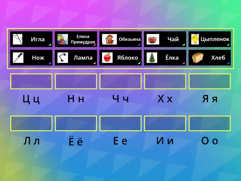 Елена Премудрая - Е е, Ёлка - Ё ё, Игла - И и, Лампа - Л л, Нож - Н н, Обезьяна - О о, Хлеб - Х х, Цыпленок - Ц ц, Чай - Ч ч, Яблоко - Я я,