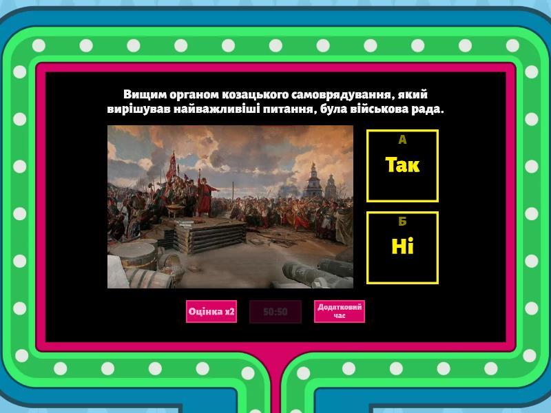 1) Вищим органом козацького самоврядування, який вирішував найважливіші питання, була військова рада. a) Так b) Ні 2) Територіальна громада - первинна (базова) адміністративно-територіальна одиниця місцевого самоврядування України a) Ні b) Так 3) Україна ратифікувала Європейську Хартію місцевого самоврядування у 2015 році a) Так b) Ні 4) Основним законом, за яким функціонує територіальна громада є Закон України «Про місцеве самоврядування в Україні» a) Ні b) Так 5) Станом на сьогодні в Україні функціонує 1480 громад. a) Так b) Ні 6) Депутати міської/селищної/сільської ради отримують зарплатню a) Ні b) Так 7) Міський/сільський/селищний голова обирається строком на 6 років a) Так b) Ні 8) Представницький орган місцевого самоврядування - виборний орган (рада) складається з депутатів a) Ні b) Так 9) Статут громади приймається міським/селищним/сільським головою з метою врахування історичних, національно-культурних, соціально-економічних та інших особливостей здійснення місцевого самоврядування. a) Так b) Ні 10) Під час призначення на посаду в міській/селищній/сільській раді особа приймає Присягу. a) Ні b) Так 11) Загальні збори жителів територіальної громади є формою їх безпосередньої участі у вирішенні питань місцевого значення. a) Так b) Ні 12) Індивідуальні характеристики й особливості, такі як національність, колір шкіри, релігійні переконання чи мова, впливають на можливість жити у громаді. a) Ні b) Так 13) Бюджет територіальної громади складається з двох частин: доходи та витрати. a) Так b) Ні 14) Податок на додану вартість належить до доходів бюджету територіальної громади a) Ні b) Так 15) Найдієвішим інструментом впливу громадськості (жителів громади) на бюджетний процес є участь у громадському бюджеті. a) Так b) Ні 16) Знайти відомості про доходи і витрати вашої територіальної громади можна виключно на сайті міської/сільської/селищної ради. a) Ні b) Так