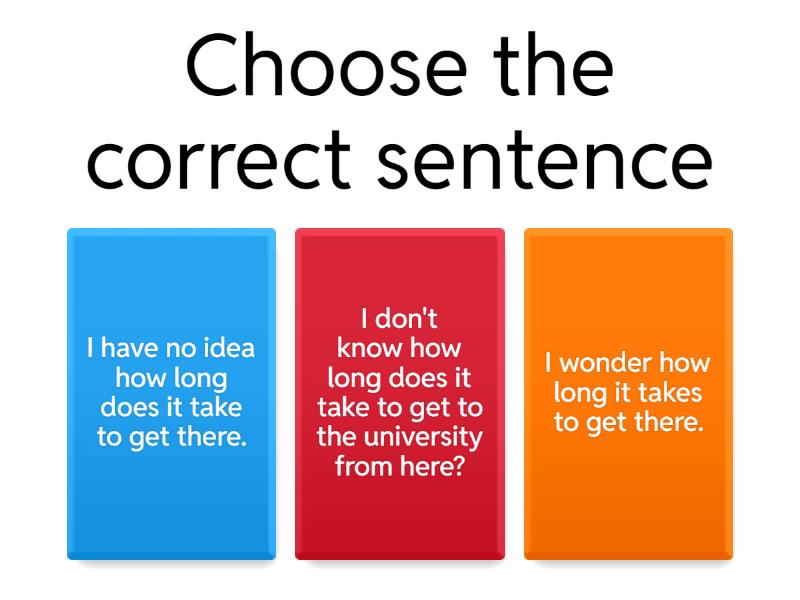 1) Choose the correct sentence a) I have no idea how long does it take to get there. b) I don't know how long does it take to get to the university from here? c) I wonder how long it takes to get there. 2) Choose the correct sentence a) I was wondering if you knew what are your plans for the future? b) Please tell me what your plans are after you graduate. c) Have you decided what are you going to do next year? 3) Choose the correct sentence a) I wish I knew what was Carol doing yesterday. b) Does anyone know why Carol was absent from class yesterday? c) Have you found out whether or not was Carol going to the hospital? 4) Choose the correct sentence a) I was wondering is it going to rain. b) Please tell me what did the weather forecast say about this weekend c) Do you know what the weather is supposed to be like on the weekend? 5) Choose the correct sentence a) Can anyone remember what did we learn on last week's class? b) Does anyone know what the topic of last class's lecture was? c) We need to find out what was the lecture last class.