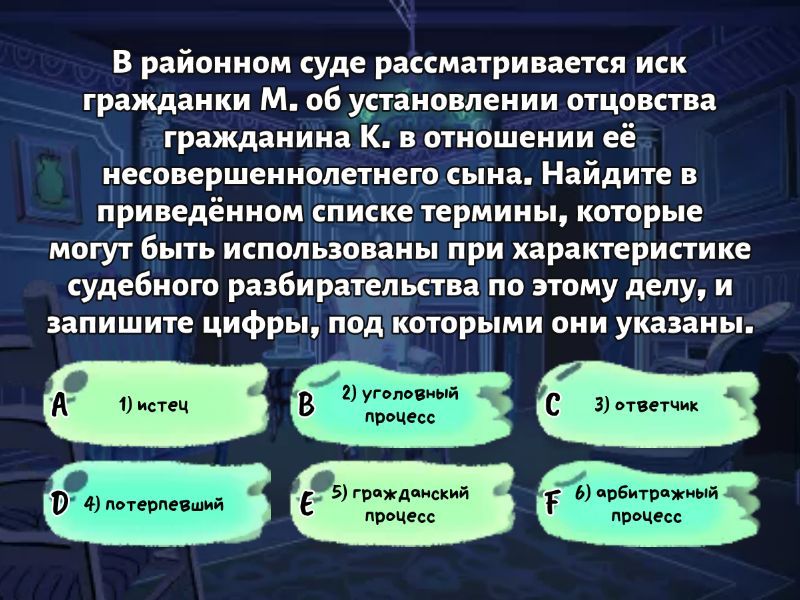 1) В районном суде рассматривается иск гражданки М. об установлении отцовства гражданина К. в отношении её несовершеннолетнего сына. Найдите в приведённом списке термины, которые могут быть использованы при характеристике судебного разбирательства по этому делу, и запишите цифры, под которыми они указаны. a) 1) истец b) 2) уголовный процесс c) 3) ответчик d) 4) потерпевший e) 5) гражданский процесс f) 6) арбитражный процесс 2) Найдите в приведённом ниже списке формы, в которых могут создаваться юридические лица, являющиеся коммерческими организациями. Запишите цифры, под которыми они указаны. a) 1) хозяйственное общество b) 2) производственный кооператив c) 3) благотворительный фонд d) 4) общественное объединение e) 5) хозяйственное товарищество f) 6) потребительский кооператив 3) Организационно-правовая форма фирмы, оказывающей услуги по ремонту обуви и сумок, – производственный кооператив. Найдите в приведённом ниже списке черты, отличающие производственный кооператив от акционерного общества, и запишите цифры, под которыми они указаны. a) 1) обязанность работников соблюдать трудовую дисциплину b) 2) требование бережно относиться к имуществу работодателя c) 3) участники – граждане (физические лица), число учредителей не менее 5 d) 4) право работников на участие в управлении предприятием. e) 5) распределение прибыли между работниками в соответствии с их трудовым участием f) 6) обязательное заключение трудового договора с работниками 4) 16-летний гражданин России Сергей обратился в суд с заявлением об эмансипации. Найдите в приведённом ниже списке позиции, соответствующие процессу эмансипации. Запишите цифры, под которыми они указаны. a) 1) заявитель b) 2) потерпевший c) 3) полиция d) 4) орган опеки и попечительства e) 5) гражданское право f) 6) уголовно-процессуальный кодекс РФ 5) Водоканал города Х является муниципальным унитарным предприятием. Что из приведённого в списке соответствует отличительным признакам данной формы организации предпринимательской деятельности? (ГУПы) Запишите цифры, под которыми они указаны. a) 1) высшим органом управления является общее собрание его членов, которое решает важнейшие вопросы деятельности фирмы, в том числе избирает постоянно действующие исполнительные органы – правление и/или председателя. b) 2) уставный капитал разделен на определенное число акций c) 3) коммерческая организация не наделена правом собственности на имущество, закреплённое за ней собственником. d) 4) собственник ГУПа обладает правом назначения на должность руководителя предприятия e) 5) имущество предприятия принадлежит ему на праве хозяйственного ведения или на праве оперативного управления, является неделимым и не может быть распределено по вкладам. f) 6) прибыль предприятия распределяется между его работниками в соответствии с их трудовым участием. 6) Анне 17 лет. Найдите в приведённом списке права, отражающие её правовой статус, и запишите цифры, под которыми они указаны a) 1) Анна может получить в подарок велосипед b) 2) Анна может купить квартиру без разрешения законных представителей c) 3) Анна может открыть вклад в банке d) 4) Анна не может заключить трудовой договор e) 5) Анна может приобрести продукты в магазине у дома f) 6) Анна может заключать трудовой договор (работа курьера) с согласия родителей 7) Акционерное общество производит кондитерские изделия. На