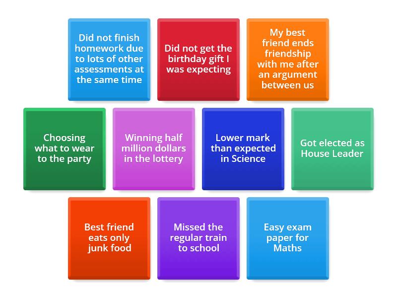 Choosing what to wear to the party - INTERNAL LOCUS OF CONTROL, Easy exam paper for Maths - EXTERNAL LOCUS OF CONTROL, Lower mark than expected in Science - INTERNAL LOCUS OF CONTROL, Winning half million dollars in the lottery - EXTERNAL LOCUS OF CONTROL, Best friend eats only junk food - EXTERNAL LOCUS OF CONTROL, Missed the regular train to school - INTERNAL LOCUS OF CONTROL, Did not finish homework due to lots of other assessments at the same time - INTERNAL LOCUS OF CONTROL, Did not get the birthday gift I was expecting - EXTERNAL LOCUS OF CONTROL, Got elected as House Leader - EXTERNAL LOCUS OF CONTROL, My best friend ends friendship with me after an argument between us - INTERNAL & EXTERNAL LOCUS OF CONTROL,