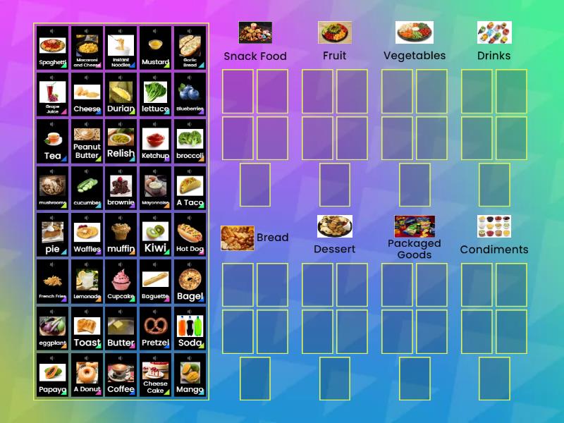 Snack Food: Hot Dog, French Fries, Instant Noodles, A Donut, A Taco, Fruit: Durian, Blueberries, Kiwi, Mango, Papaya, Vegetables: mushrooms, lettuce, broccoli, cucumber, eggplant, Drinks: Coffee, Tea, Lemonade, Grape Juice, Soda, Bread: Toast, Baguette, Pretzel, Bagel, Garlic Bread, Dessert: Cheese Cake, Cupcake, muffin, brownie, pie, Packaged Goods: Spaghetti, Macaroni and Cheese, Cheese, Waffles, Butter, Condiments: Ketchup, Mustard, Relish, Peanut Butter, Mayonnaise,