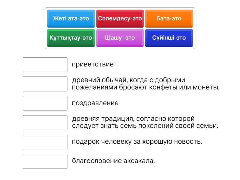 Сүйінші-это - подарок человеку за хорошую новость., Бата-это - благословение аксакала., Жеті ата-это - древняя традиция, согласно которой следует знать семь поколений своей семьи., Сәлемдесу-это - приветствие, Шашу -это - древний обычай, когда с добрыми пожеланиями бросают конфеты или монеты., Құттықтау-это - поздравление,