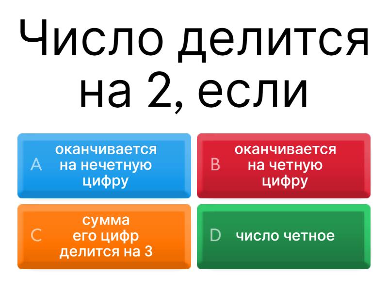 1) Число делится на 2, если a) оканчивается на нечетную цифру b) оканчивается на четную цифру c) сумма его цифр делится на 3 d) число четное 2) Число делится на 3, если a) число нечетное b) сумма его цифр делится на 3 c) последняя цифра делится на 3 d) оканчивается на 0 3) Число делится на 5, если a) сумма его цифр делится на 5 b) число четное c) оканчивается на 0 или 5 d) начинается на 5 4) Верно или неверно a) Все числа, делящиеся на 9, делятся и на 3 b) Все числа, делящиеся на 2, делятся и на 4 c) Если число делится на 2 и на 3, то оно делится и на 6 d) Если число делится на 4 и на 6, то оно делится и на 24 5) Число делится на 10, если: a) сумма его цифр делится на 10 b) число четное c) оканчивается на 0 d) число круглое 6) Верно ли утверждение: если число делится на 4 и на 5, то оно делится и на 20? a) нет b) да 7) Сколько существует двузначных чисел, делящихся на 7: a) 21 b) 7 c) 13 d) 11 8) Найдите наименьшее трехзначное число, которое делится на 2, 3 и 5 a) 120 b) 180 c) 150 d) 210 9) Число делится на 9, если: a) последняя цифра делится на 9 b) сумма его цифр делится на 9 c) оканчивается на 0 d) число нечетное