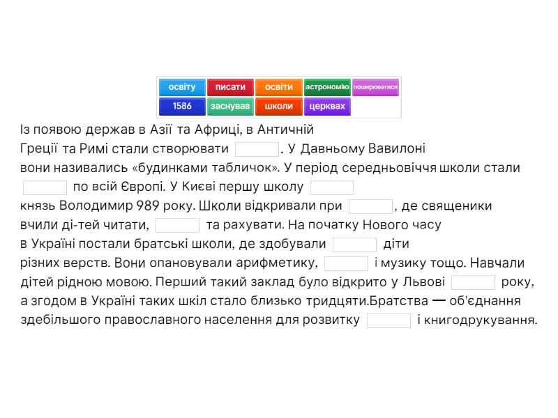 Із появою держав в Азії та Африці, в Античній Греції та Римі стали створювати ____. У Давньому Вавилоні вони називались «будинками табличок». У період середньовіччя школи стали ____ по всій Європі. У Києві першу школу ____ князь Володимир 989 року. Школи відкривали при ____, де священики вчили ді-тей читати, ____ та рахувати. На початку Нового часу в Україні постали братські школи, де здобували ____ діти різних верств. Вони опановували арифметику, ____ і музику тощо. Навчали дітей рідною мовою. Перший такий заклад було відкрито у Львові ____ року, а згодом в Україні таких шкіл стало близько тридцяти.Братства — об’єднання здебільшого православного населення для розвитку ____ і книгодрукування.